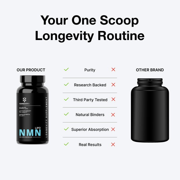 Support your cellular health and vitality with Genevity+ Pure NMN. Our ultra-pure formula boasts 99%+ purity for optimal absorption, promoting cellular energy and overall well-being. Plus, it's shelf-stable for guaranteed freshness.